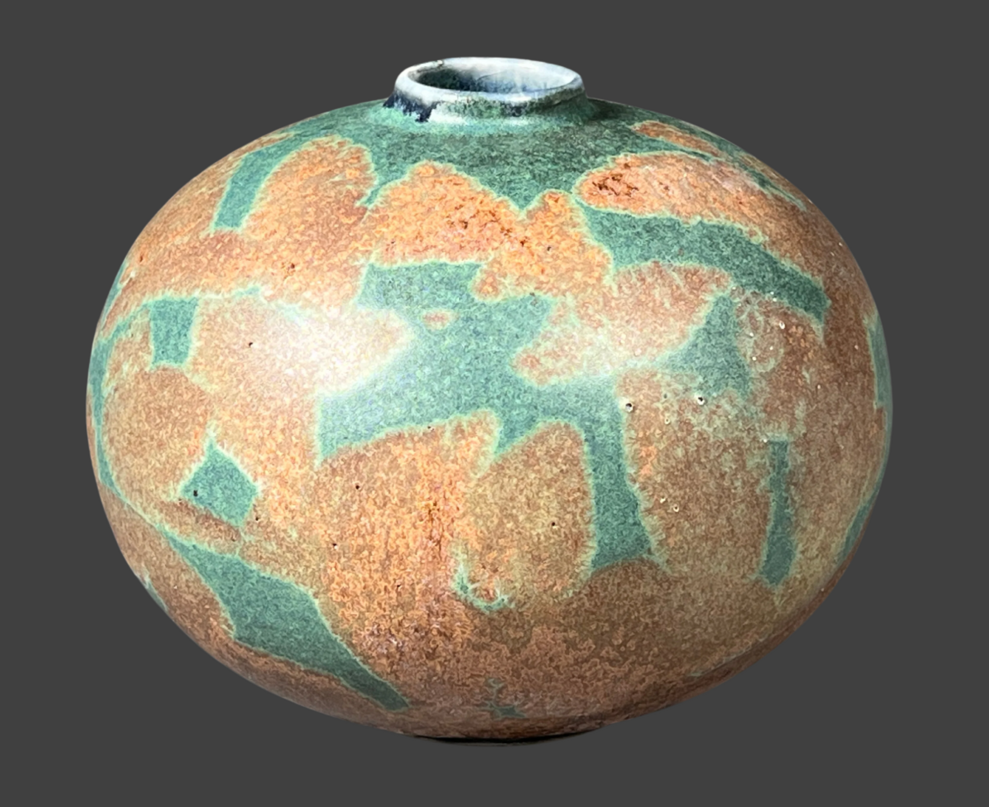 5" x 4" Porcelain globe vase, Reduction fired with titanium and cobalt green glaze and rutile and iron wash.