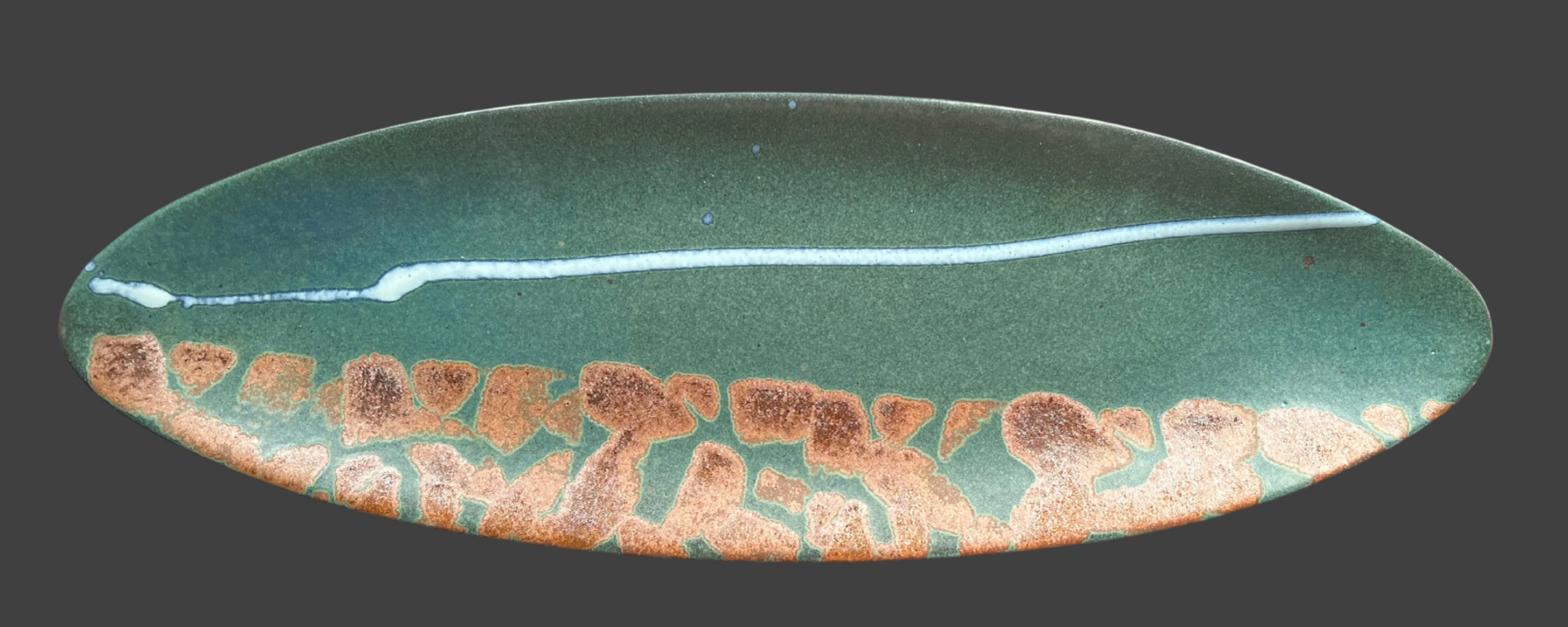 23" x 7-3/4" oval tray Reduction fired with titanium and cobalt green glaze. Suitable for hanging.